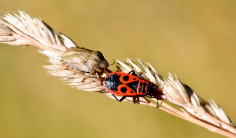 Feuerwanze & Stinkwanze zusammen auf einem vertrockneten Grashalm.