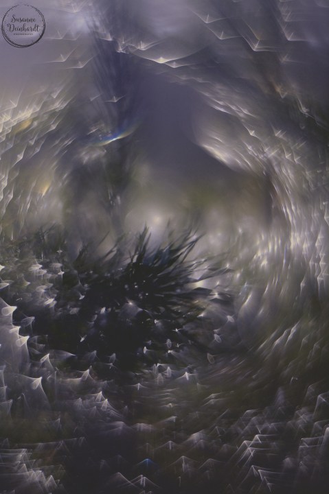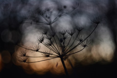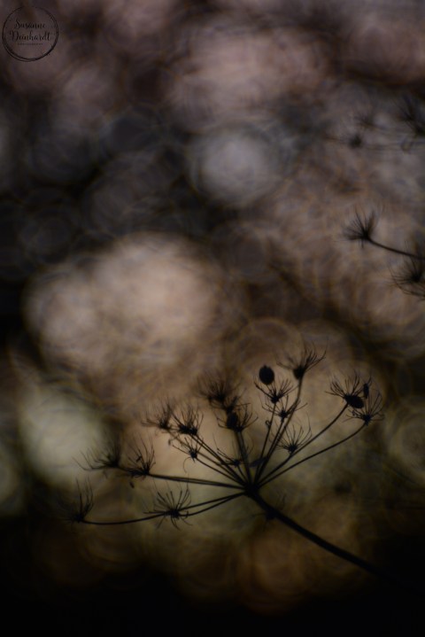 Endlich hat es geklappt! Kurz nach Sonnenuntergang bin ich zu der Busch-/Baumreihe am Feldweg gegangen und habe die dürren Wilden Möhren fotografiert. Typisch Trioplan-Geblubber!