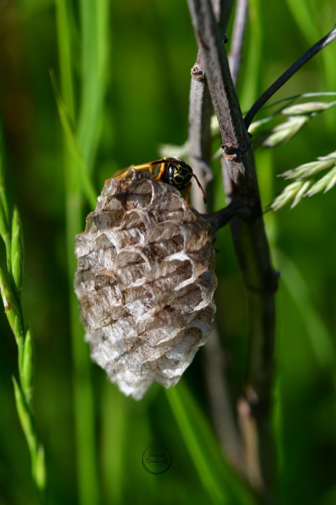 Diese Wespe hat ihr Nest an einen Grashalm gebaut und es gut bewacht. Näher habe ich mich nicht herangetraut…
