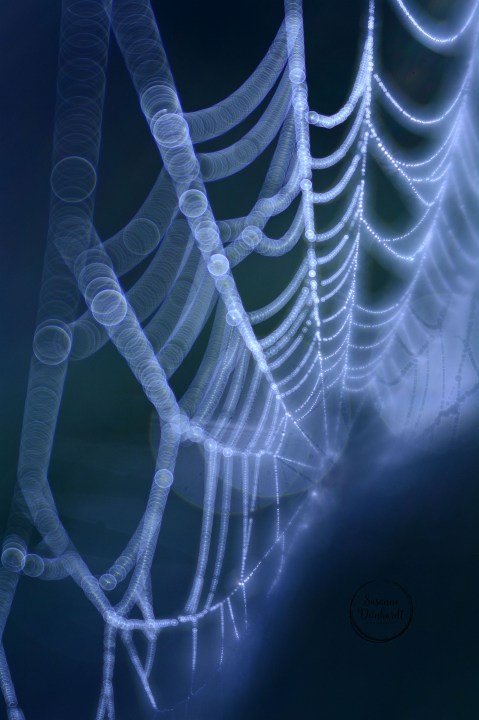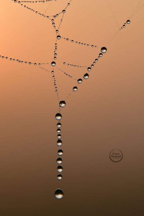 Wie funkelnde Glasperlen sehen sie aus, die winzigen Tautropfen auf dem Spinnennetz.