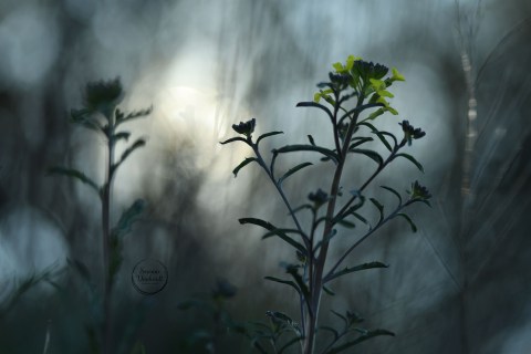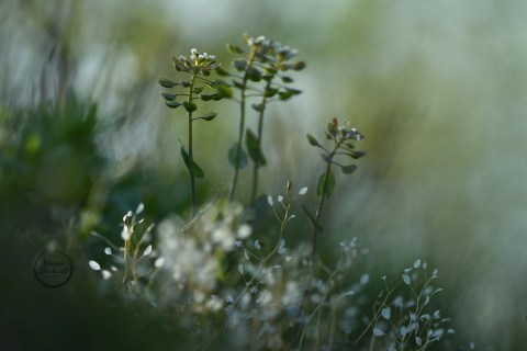 Was für ein Name für eine kleine Pflanze! Im Vordergrund: Samenstände von Hungerblümchen in der Morgensonne.