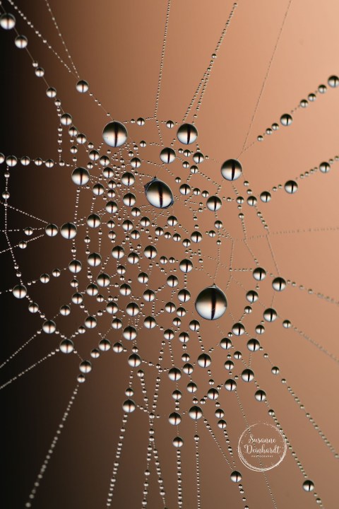 Tautröpfchen wie durchsichtige Perlen, aufgefädelt auf ein Spinnennetz am frühen (kalten) Herbstmorgen!