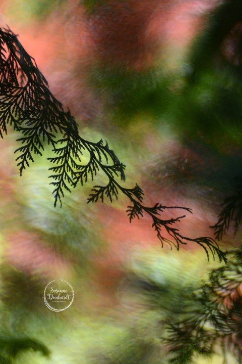Eine ganz besondere Lichtstimmung: Die Nachmittagssonne hat in den Blättern der Blutbuche ein tolles, buntes Bokeh gezaubert.