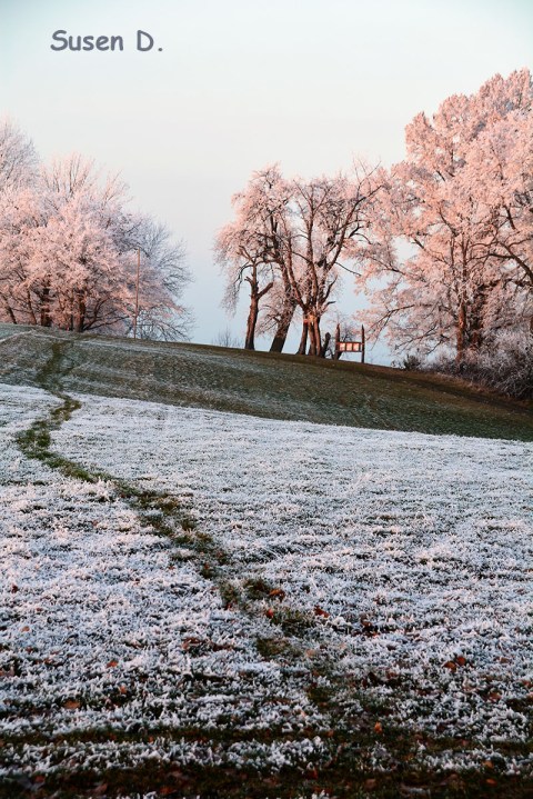 Hier hat die untergehende Sonne die Winterszenerie in einen zartrosa Farbton getaucht. Dazu bilden die Fußspuren eine schöne Führungslinie.