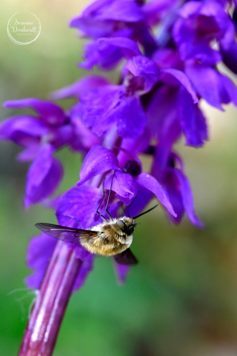 Die Orchideen blühen jedes Jahr früher. Auf dieser Blüte hat sich ein Wollschweber niedergelassen, eine „Fliege im Hummelpelz“.