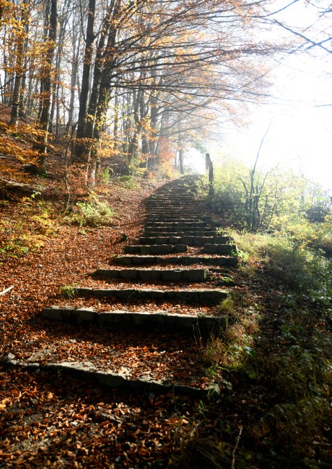 Ein Gutes hat der Nebel: man kann magische, verträumte Fotos im Wald machen! Das bunte Laub wird schön in Szene gesetzt.