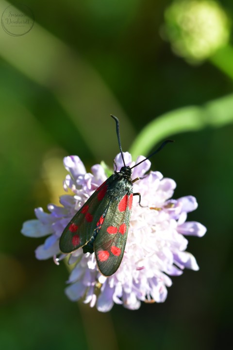 Mit ihrer auffälligen Färbung warnen diese Schmetterlinge (auch Sechsfleck-Widderchen genannt) ihre Fressfeinde, denn sie sind giftig.