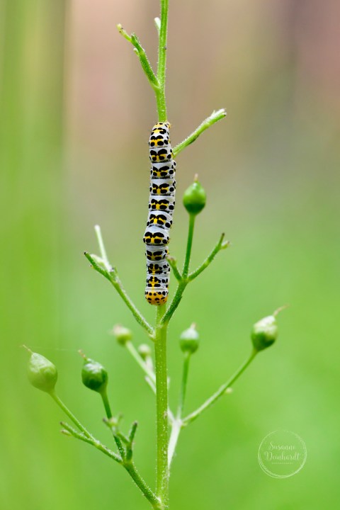 Die Raupe sitzt auf ihrer Wirtspflanze, der Geflügelten Braunwurz.